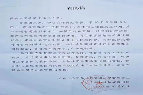? ?2022年10月3日晚21時(shí)25分,在長(zhǎng)春市軌道交通二號(hào)線東方廣場(chǎng)站,兩名乘客在下扶梯時(shí),因?yàn)樯眢w間的相互碰撞發(fā)生了爭(zhēng)執(zhí)。其中,有一名乘客是喝過(guò)酒的。在現(xiàn)場(chǎng)執(zhí)勤的長(zhǎng)春保安集團(tuán)軌道交通大隊(duì)保安員趙春雷看到后,立即對(duì)兩名乘客進(jìn)行了勸阻。但兩名乘客情緒十分激動(dòng),多次想要?jiǎng)邮?。保安員趙春雷都及時(shí)進(jìn)行了制止,才沒(méi)使事態(tài)繼續(xù)擴(kuò)大,他同時(shí)將情況上報(bào)給了駐站民警,配合民警對(duì)兩名乘客繼續(xù)進(jìn)行了勸阻。經(jīng)駐站民警調(diào)解、教育后,兩名乘客認(rèn)識(shí)到錯(cuò)誤,相互進(jìn)行了道歉后,各自乘車離站。在舉國(guó)歡度國(guó)慶節(jié)和二十大即將召開(kāi)之際,保安員趙春雷同志工作認(rèn)真負(fù)責(zé),應(yīng)對(duì)突發(fā)事件挺身而出,處理方式、方法得當(dāng),成功阻止乘客間發(fā)生肢體沖突,為地鐵安保維穩(wěn)工作作出了應(yīng)有貢獻(xiàn)。長(zhǎng)春市公安局交通治安管理支隊(duì)世紀(jì)大街地鐵治安派出所對(duì)趙春雷提出表?yè)P(yáng)。