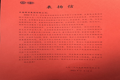 ? ? ? ? ?近日,長春保安集團收到一封來自大眾一汽平臺零部件股份有限公司發(fā)來的表揚信。信中對長春保安集團綠園分公司駐該公司保安執(zhí)勤隊全體保安員在2022年3月疫情防控關鍵時刻,主動請纓、不計報酬、扎實工作,全力協(xié)助客戶單位認真做好疫情防控工作的敬業(yè)精神和高尚品格給予了充分肯定和贊揚。